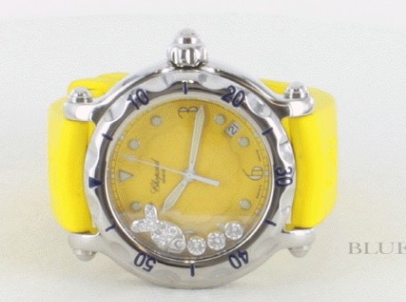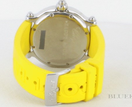 シルバーボディにダイヤフィッシュとイエローの文字盤が浮かび、ラバーがビビットビーチに仕上げたハッ ピースポーツです。フェイスにはフィッシュが海中を遊泳しているかの様にスイスイと煌めき、蛍光塗料を施した指針やインデックスは視認性に富みます。 38mmサイズが扱いやすく、目を惹く存在感を放つモデルです。