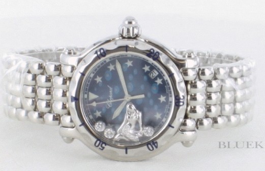 シルバーボディに星座の様なブルーシェル文字盤、艶やかな5連ブレスが美しくアクティブな星座モデルで す。フェイスはシェルの濃淡にダイヤとセクシーな乙女が夜空を舞うかのよう。またスターインデックスや蛍光塗料を施した指針は視認性抜群。38mmと扱い やすいサイズで手元で夜空が輝きます。