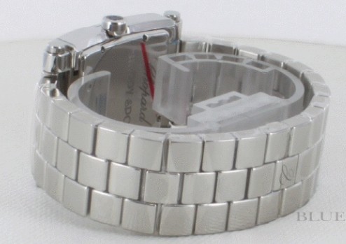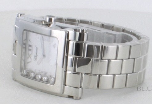 シルバーのスクエアボディにホワイト文字盤が浮かび、幅広の3連ブレスが煌めきジェントルに仕上げたハッピースポーツです。フェイスにはコロコロとダイヤが煌めきローマンインデックスが時を刻みます。35×32mmサイズが存在感ある手元を演出する時計です。