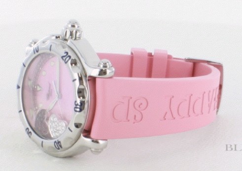シルバーボディにピンクシェルが浮かび、ピンクラバーがキュートに仕上げたハッピースポーティです。 フェイスにはハート模様とハートのダイヤとピンクサファイアがコロコロと可愛らしく。蛍光塗料を施した指針やインデックスは視認性に富みます。38mmサ イズが扱いやすく、目を惹く存在感を放つモデルです。