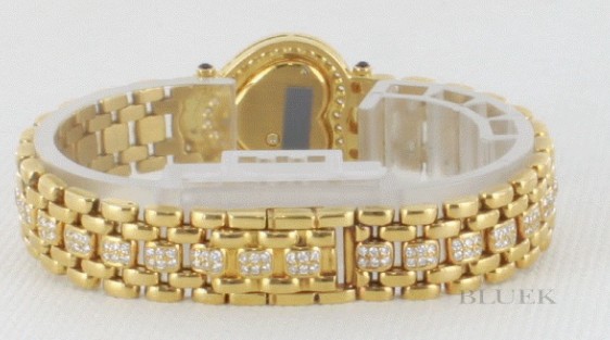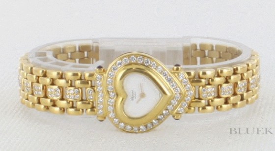 イエローゴールド金無垢ボディにダイヤのハートケースや3連ブレスがキラキラと敷き詰められ、ゴージャ スに仕上げたハートです。フェイスはホワイト文字盤が気品高く、ゴールドの指針が時を刻みます。23×22mmサイズがしっくりと手元にフィットし、シー ンを華やかに演出する時計です。