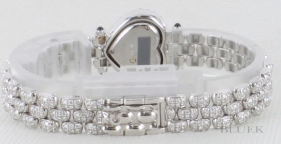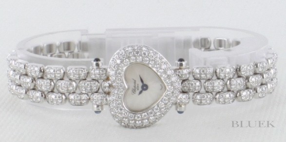 オールダイヤのハートケースや3連ブレスにダイヤがキラキラと敷き詰められ、エレガントキュートに仕上 げたハートです。フェイスは放射状に広がるギョーシェ模様が光を拡散しダイヤを眩しく照らし、ブルーの指針が時を刻みます。22×19mmサイズがしっく りと手元にフィットし、シーンを華やかに演出する時計です。
