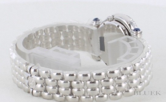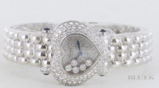 金無垢ホワイトゴールドのハートボディにダイヤのベゼルや文字盤が美麗に、3連コマブレスが艶やかなエ レガントウォッチです。フェイスでは5つのダイヤがコロコロと転がりブルーの指針が品よく時を刻みます。30×25mmサイズがフィットし、パーティー シーンなど手元を華やかに魅せるハッピーダイヤモンドです。