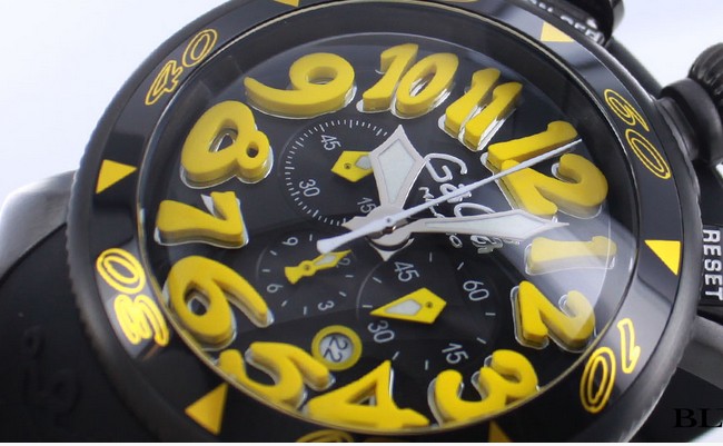ガガ・ミラノ独特のデザインにクロノグラフ機能搭載モデル。文字盤に広がる大型のインデックスが他にはない唯一無二の特徴です。