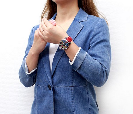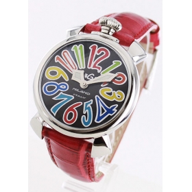 個性的なガガミラノの人気モデルと言え、48mmのビックフェイスに文字盤いっぱいにデザインされたカラフルなアラビアインデックスが特徴のモデルです。