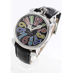 個性的なガガミラノの人気モデルと言え、48mmのビックフェイスに文字盤いっぱいにデザインされたカラフルなアラビアインデックスが特徴のモデルです。
