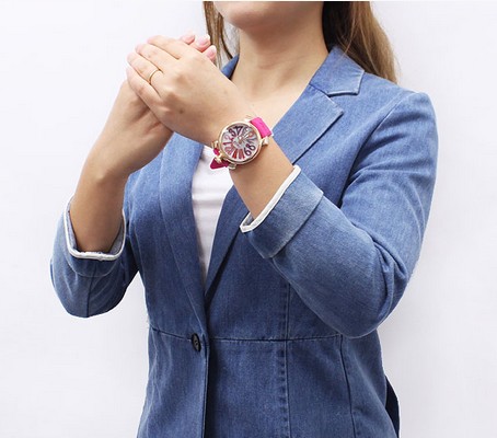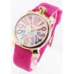 個性的なガガミラノの人気モデルと言え、48mmのビックフェイスに文字盤いっぱいにデザインされたカラフルなアラビアインデックスが特徴のモデルです。