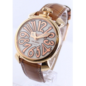 個性的なガガミラノの人気モデルと言え、48mmのビックフェイスに文字盤いっぱいにデザインされたカラフルなアラビアインデックスが特徴のモデルです。
