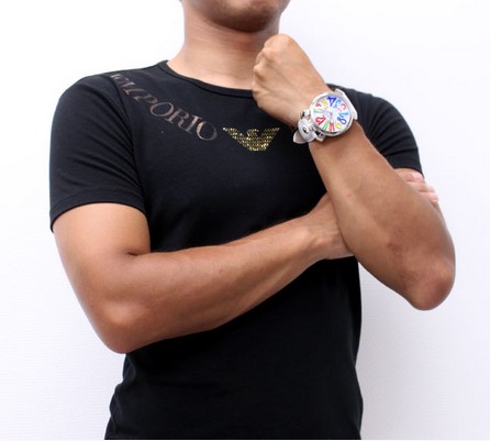 個性的なガガミラノの人気モデルと言え、48mmのビックフェイスに文字盤いっぱいにデザインされたカラフルなアラビアインデックスが特徴のモデルです。