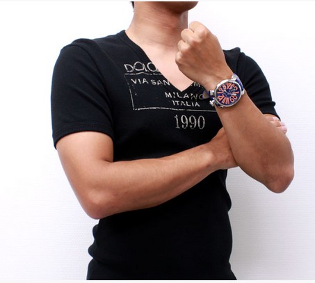 個性的なガガミラノの人気モデルと言え、48mmのビックフェイスに文字盤いっぱいにデザインされたカラフルなアラビアインデックスが特徴のモデルです。