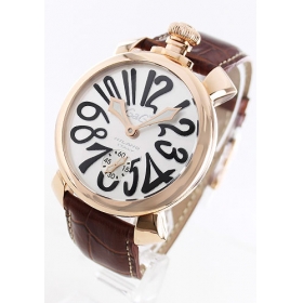 個性的なガガミラノの人気モデルと言え、48mmのビックフェイスに文字盤いっぱいにデザインされたカラフルなアラビアインデックスが特徴のモデルです。
