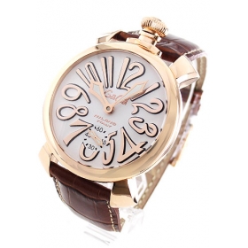 個性的なガガミラノの人気モデルと言え、48mmのビックフェイスに文字盤いっぱいにデザインされたカラフルなアラビアインデックスが特徴のモデルです。