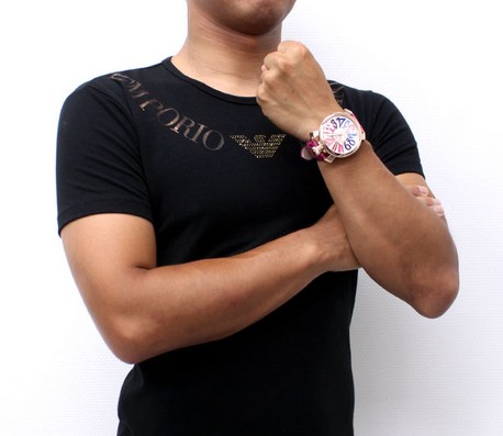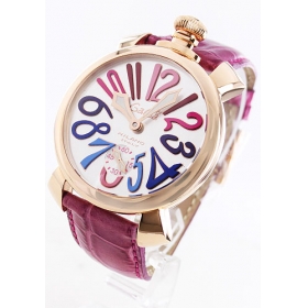 個性的なガガミラノの人気モデルと言え、48mmのビックフェイスに文字盤いっぱいにデザインされたカラフルなアラビアインデックスが特徴のモデルです。