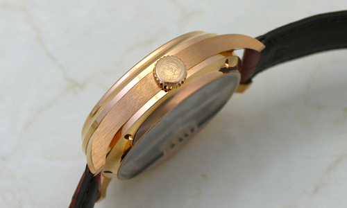 また巻き上げ機構につきましては故障、消耗などに強いペラトン双方向自動巻き機構を装備しております。4桁の数字にて表示するパーペチュアルカレンダーです。 12時位置のムーンフェイズには次回の満月までの残りの日数をカウントダウン機能が搭載されております。
