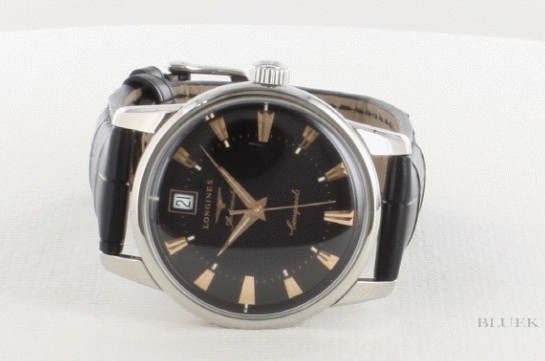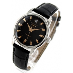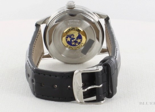 1955年に発表され、大きな話題となったコンクエストの復刻モデルです。当時の雰囲気を醸し出すドー ムシェイプ風防と12時位置の日付窓にも注目。ブラック文字盤のピンクゴールド指針とくさびインデックスが、さりげなくレトロな香りと高級感を漂わせてい ます。クラシカルな35ミリケースに組み合わされたのは、ダイヤルと同じ黒いアリゲーターベルト。時代を経ても決して色あせることのない気品とエレガント な表情は、さすが老舗ブランドの風格。裏蓋のロンジンを象徴する星と波をモチーフにした七宝焼きメダルも必見です!