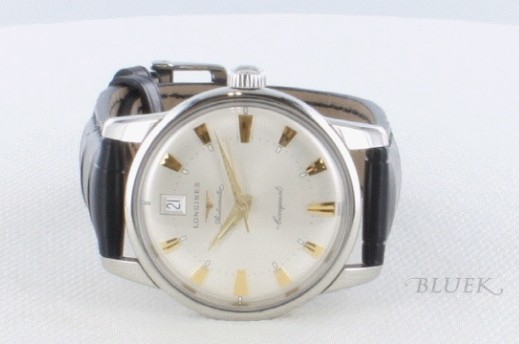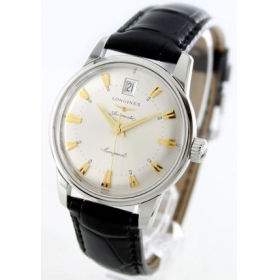 シルバーボディにラウンドした文字盤や風防が浮かび、ブラックアリゲーターレザーがシンプルクラシカル にきめたコンクエストです。フェイスには放射状に光沢が広がり、ゴールドのくさびインデックスや指針が艶やかに時を刻みます。裏蓋の波と星が描かれた青い 七宝焼エンブレムがこだわり。35mmの扱いやすいサイズで、日常使いからスーツスタイルまで幅広く活躍します。