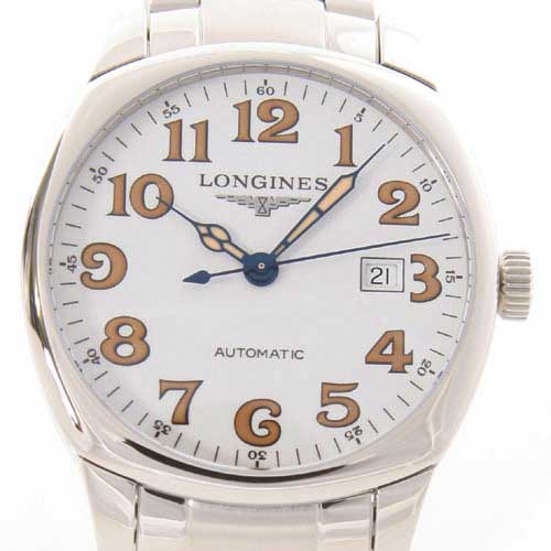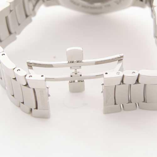 特徴的な形のケースの中にはシンプルなホワイトの文字盤に個性的なアラビアインデックスが並んでいます。指針には蛍光塗料が施され視認性も抜群。3時位置には日付表示も搭載され、実用性に優れた仕上がりになっています。
