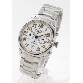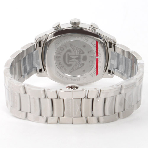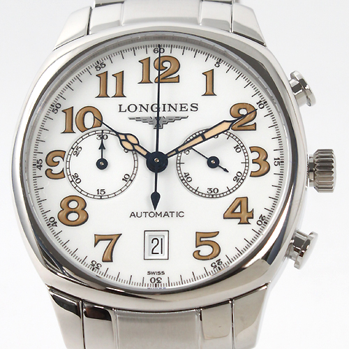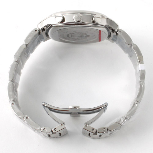 ホワイト文字盤に蛍光塗料を施したブルーの指針、視認性の高いアラビアインデックスを配置。12時位置にブランドロゴ、3時位置にスモールセコンド(秒針用のダイヤル)、6時位置に日付表示とオートマチックであることを示す刻印、9時位置に30分計を搭載。