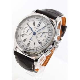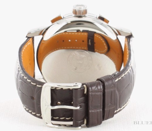 45ミリのパワフルなビッグケースに、横目玉クロノ、ローマンインデックス、青いブレゲ針などヴィン テージ感たっぷりのヘリテージクロノグラフです。そしてもうひとつ、この時計にはユニークなしかけがあります。まるで懐中時計のように、リューズを押すと 裏蓋が開いて、スケルトンの中蓋からムーブメントの動きを堪能できるという非常に凝った趣向。まさに時計好きにはたまらない意匠です。レトロな表情のシル バー文字盤とアリゲーターベルトも見事に調和し、他にはないデザインと楽しいしかけが男心をくすぐります。