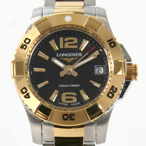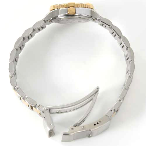 ブラック文字盤に蛍光塗料を施したゴールドの指針、アラビアとバーのインデックスを配置。12時位置にブランドロゴ、3時位置に日付表示。