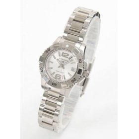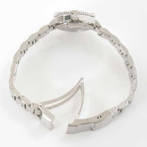 ベゼルには逆回転防止ベゼルを採用。シルバー文字盤にアラビアとバーのインデックスを配置。先端に赤色を施した秒針。蛍光塗料が施された指針とインデックス。3時位置に日付表示を搭載