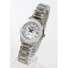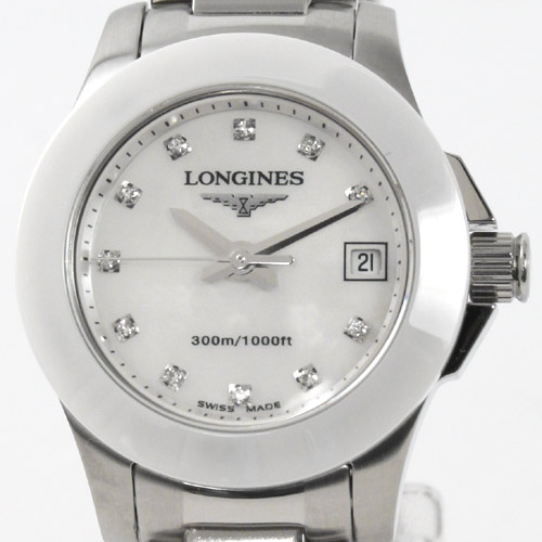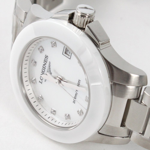 ホワイトシェル文字盤にシルバーの指針、ダイヤインデックスを配置。12時位置にブランドロゴ、3時位置に日付表示を搭載。ベゼルにはセラミックベゼルを採用。