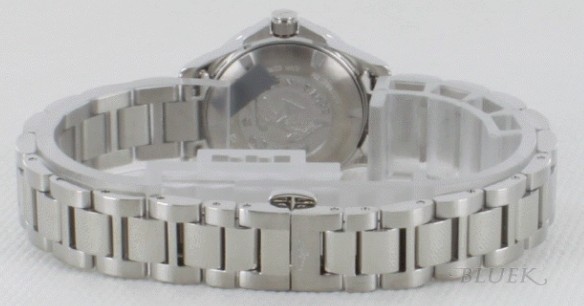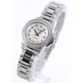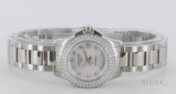 シルバーボディに2連ダイヤベゼルやホワイトシェル文字盤に浮かぶダイヤインデックスが煌びやかに、3 連ブレスがどこかエレガントスポーティな300m防水コンクエストです。フェイスはシェルの光沢が美しく、3時位置に日付表示を搭載。25mmサイズで手 元で美しく、透明感ある女性らしさを演出する美と動を融合した時計です。