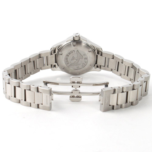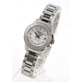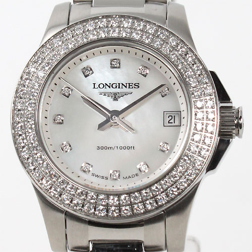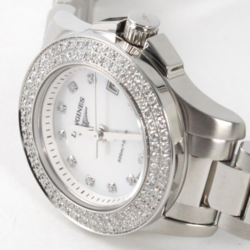ホワイトシェル文字盤にシルバーの指針、ダイヤインデックスを配置。12時位置にブランドロゴ、3時位置に日付表示を搭載。ベゼルにはダイヤモンドを装飾。