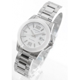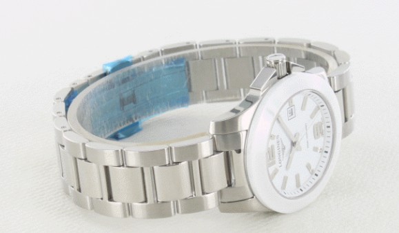 つややかなホワイトセラミックベゼルが印象的なコンクエストです。ほどよい29ミリケースに、ホワイト ダイヤルと美しいフォルムの3連ブレスが見事にマッチ。アクティブな女性に似合いそうな颯爽とした雰囲気と、ワークスタイルにもさらりと馴染むシンプルで モダンな表情が魅力となっています。このスポーティかつエレガントな洗練されたデザインに加え、300m防水機能を備えていることも大きな魅力。ダイビン グ好きの女性はもちろん、アウトドアからインドアまで、どんな装いやシーンにも活躍するお洒落で格好いい時計です。