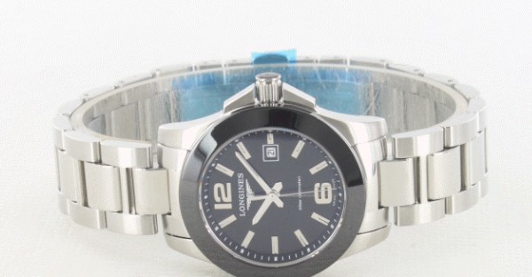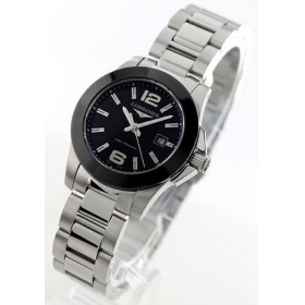 ブラックとシルバーでまとめられた、クールスポーティなコンクエストです。ブラックベゼルにはセラミッ クが採用され、つややかな光沢を放つとともに、傷がつきにくく耐久性が高いことも大きな魅力となっています。ブラックダイヤルには12時と6時のみアラビ ア数字、バーインデックスを配置。ブラックにシルバーが映え、シンプルな美しさと視認性の高さを確保しています。3時位置には日付窓を配し、実用性も抜 群。このブラックフェイスに、美しいフォルムの3連ブレスが見事にマッチし、格好よくお洒落な手元を彩ります。