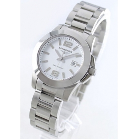 ミラーボディにマットなホワイト文字盤が浮かび、3連ブレスでシンプルにまとめたコンクエストです。 フェイスには光沢ある12時・6時アラビア・バーインデックス、太い指針が視認性に優れ存在感抜群。リューズガードもしっかりとクォーツムーブメントで 300m防水機能搭載。29mmレディースサイズで日常使いにも最適な時計です。
