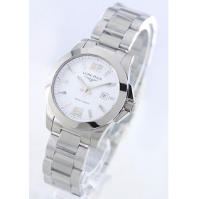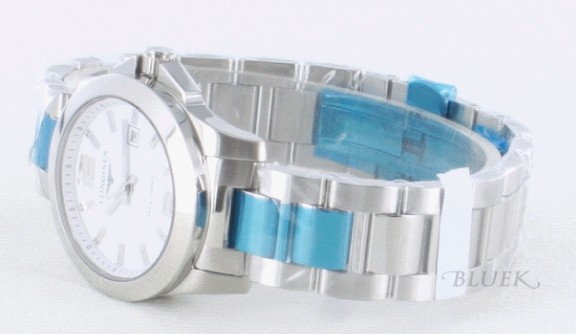 ミラーボディに艶やかなベゼルやマットなホワイト文字盤が浮かび、3連ブレスで落ち着きスタンダードに まとめたコンクエストです。フェイスには光沢ある12時・6時アラビア・バーインデックス、太い指針が視認性に優れ存在感抜群。リューズガードもしっかり とクォーツムーブメントで300m防水機能搭載。29mmレディースサイズの日常使いにも最適な時計です。