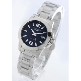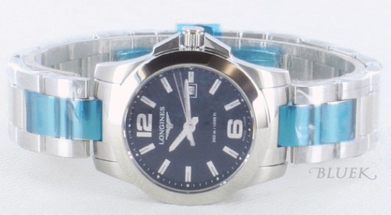 ミラーボ ディに艶やかなベゼルやマットなブラック文字盤が浮かび、3連ブレスで落ち着きクールにまとめたコンクエストです。フェイスには光沢ある12時・6時アラ ビア・バーインデックス、太い指針が視認性に優れ存在感抜群。リューズガードもしっかりとクォーツムーブメントで300m防水機能搭載。29mmレディー スサイズの日常使いにも最適な時計です。