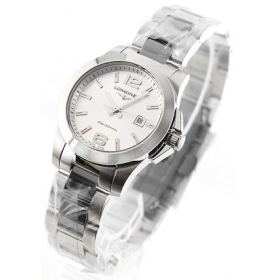 女性らしい29ミリケースに、シルバーダイヤルとステンレス3連ブレスを組み合わせた、非常にシンプル で美しいコンクエストです。見た目のシンプルさとは対照的に300m防水機能を備え、マリンスポーツを楽しむアクティブ派の女性にもぴったり。もちろん普 段使いにも格好よく、颯爽とした手元を演出してくれます。ダイヤルはすべてシルバーカラーでまとめられ、12時と6時のみアラビア数字、他はバーインデッ クスを立体的に配し、視認性と空間の美しさを確保。3時位置には日付窓があり、実用性にも優れた仕様となっています。