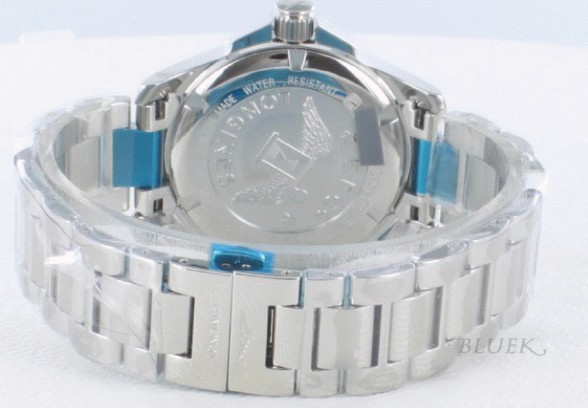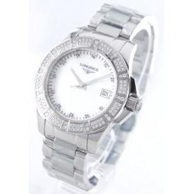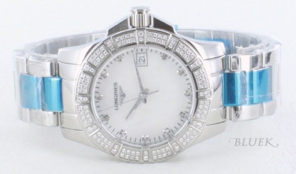 鏡面仕上げのシルバーボディに2連ダイヤベゼルやホワイトシェル文字盤に浮かぶダイヤインデックスが煌 びやかに、3連ブレスが気品に満ちたコンクエストです。フェイスはシェルの光沢が美しく3時位置に日付表示を搭載し、リューズガードもしっかりと。手元で 美しく透明感ある女性らしさを演出する時計です。