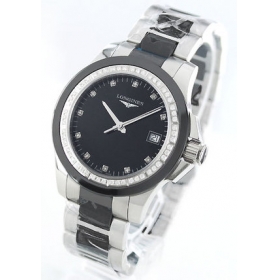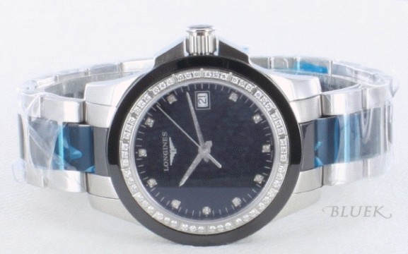 ダイヤベゼルとブラックセラミックベゼルや、ブラックセラミックを組み込んだ3連コンビブレスのコンビ ネーションがダイヤ惹き立つコンクエストです。ブラックフェイスにもダイヤインデックスが施され、3時位置に日付表示を搭載。バックスケルトンでムーブメ ントを堪能。手元で美しく存在感ある女性らしさを演出する時計です。