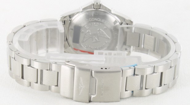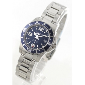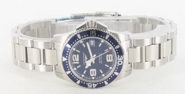メタリックブルーベゼルとブルーダイヤルに、シルバーが映える非常にお洒落なハイドロコンクエストで す。300m防水機能に加え、逆回転防止ベゼルやねじ込み式リューズなどを備えた本格的なダイバーズウォッチながら、その洗練されたデザインが大きな魅力 となっています。12、6、9の大きな文字が際立つダイヤルは非常に見やすく、蛍光塗料が施された指針やインデックスは暗い場所や深海でも視認性抜群。さ らにユニークな短針と秒針の先の赤い色も小粋なアクセントになり、お洒落でエレガントな雰囲気もたっぷりです。