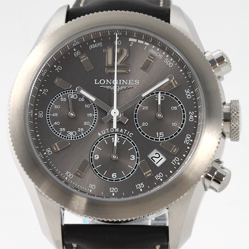 直径40mmを超える存在感があるケース。グレー文字盤に蛍光塗料を施したシルバーの指針、アラビアと バーインデックスを配置。12時位置にブランドロゴ、3時位置に30分計、4時から5時位置に日付表示、6時位置にオートマチックであることを示す刻印と 12時間計、9時位置にスモールセコンド(秒針用のダイヤル)、文字盤内周にはスピードや平均時間を簡単に算出出来るタキメーター機能を搭載。