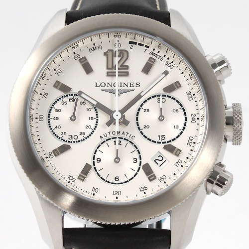 直径40mmを超える存在感があるケース。シルバー文字盤に蛍光塗料を施した同色の指針、アラビアと バーインデックスを配置。12時位置にブランドロゴ、3時位置に30分計、4時から5時位置に日付表示、6時位置にオートマチックであることを示す刻印と 12時間計、9時位置にスモールセコンド(秒針用のダイヤル)、文字盤内周にはスピードや平均時間を簡単に算出出来るタキメーター機能を搭載。