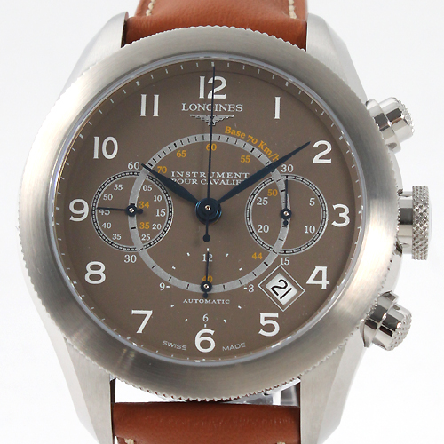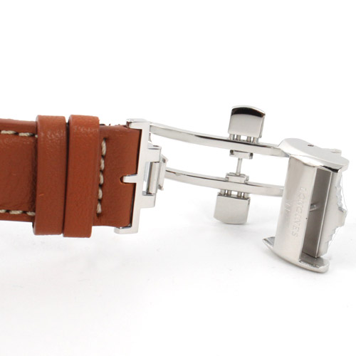 直径40mmを超える存在感があるケース。ブラウン文字盤にブルーの指針、アラビアインデックスを配 置。12時位置にブランドロゴ、3時位置に30分計、4時から5時位置に日付表示、6時位置に12時間計とオートマチックであることを示す刻印、9時位置 にスモールセコンド(秒針用のダイヤル)を搭載。文字盤中央にはスピードや平均時間を簡単に算出出来るタキメーター機能を搭載。時速70kmに対応する為 の仕様となっています。