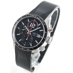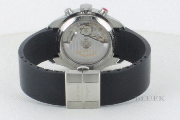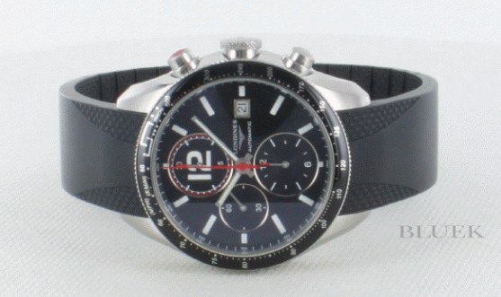 ボディにブラックのベゼルや文字盤が浮かび、3連ブレスがライトスポーティに仕上げたグランヴィテスで す。フェイスにはレッドの12時インダイヤルやタキメーターがデザインアクセントとなり、蛍光塗料を施した指針やバーインデックスは視認性に富みます。 バックスケルトンでムーブメントの動きを堪能。普段使いからジャケットスタイルまで活躍するウォッチです。