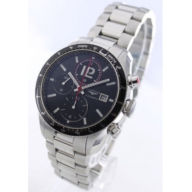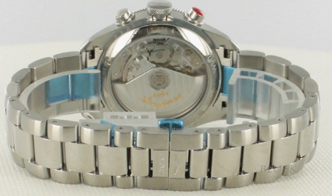ブラック文字盤に重厚感あるメタリックな3連ブレスが男らしくフィットするグランヴィテスです。マッハ 2まで計測可能なタキメーター搭載ベゼルが黒々と艶めき、レッドで縁取られた30分積算計デザインが他にはない個性的なオーラを醸し出しています。艶あり 艶無しのボディデザインが美しく、蛍光塗料を施したシルバー指針は視認性抜群。バックスケルトンでムーブメントの動きを堪能。クロノグラフ操作時の誤操作 を防ぐ為に、「スタート・ストップ」ボタンはレッドポリッシュボタン、「リセット」ボタンは刻みをつけデザイン性の高さ・視認性・触認性の高さを実現して います。