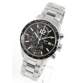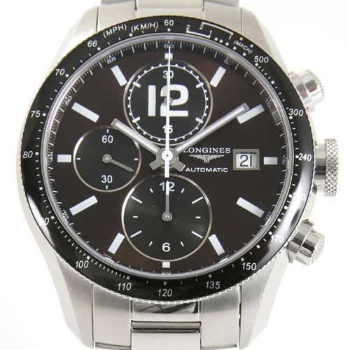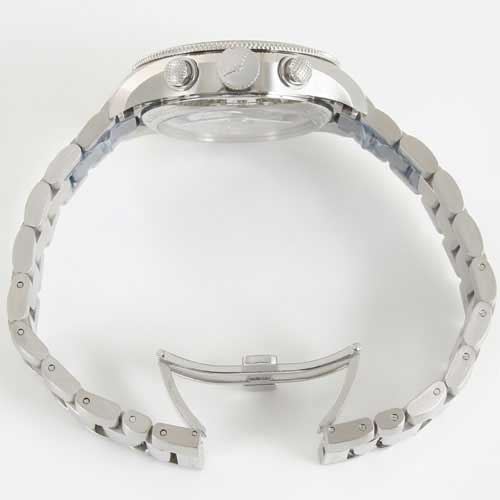 ダークブラウン文字盤に蛍光塗料を施したシルバーの指針、アラビアとバーインデックスを配置。12時位置に30分計、3時位置にブランドロゴとオートマチックであることを示す刻印、日付表示、6時位置に12時間計、9時位置にスモールセコンドを搭載。