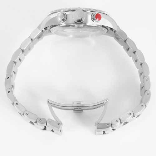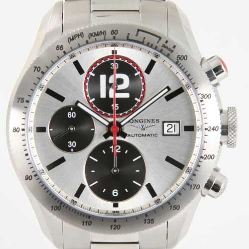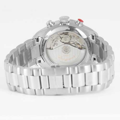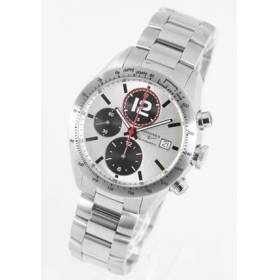 シルバー文字盤に蛍光塗料を施したブラックの指針、バーインデックスを配置。12時位置に30分計、3時位置にブランドロゴと日付表示、オートマチックであることを示す刻印、6時位置に12時間計、9時位置にスモールセコンドを搭載。