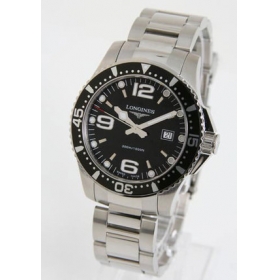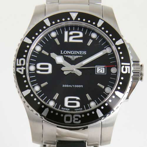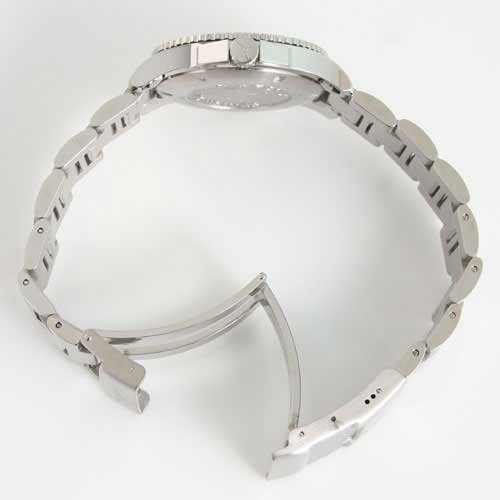 ブラック文字盤に蛍光塗料を施したシルバーの指針、アラビアとバーのインデックスを配置。12時位置にブランドロゴ、3時位置に日付表示。