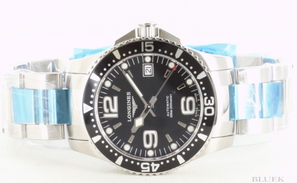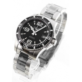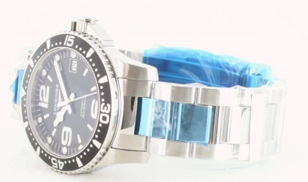 39ミリケースに、ブラックダイヤル&ベゼルと3連ブレスを組み合わせた、非常に精悍な印象のハイドロ コンクェストです。300m防水機能を備えたダイバーズウォッチながら、ビジネスシーンやプライベートでも格好いい手元を演出してくれる男らしくスポー ティな表情が大きな魅力となっています。ダイヤルには立体的な12、6、9のアラビア数字が大きく配され、シルバー指針とインデックスには蛍光塗料が施さ れているため、夜間や暗い海中でも抜群の視認性を発揮。高い機能性と実用性、そしてデザイン性にも優れた一本です。
