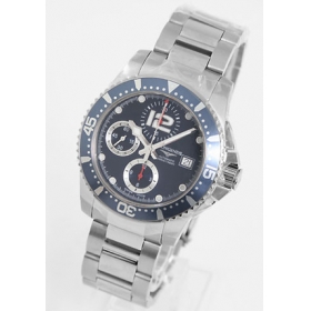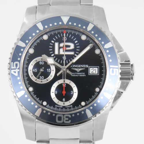 直径40mmを超える存在感があるケース。ブルー文字盤に蛍光塗料を施したシルバーの指針、アラビアと ドットインデックスを配置。12時位置に30分計、3時位置にブランドロゴと日付表示、オートマチックと300m防水を示す刻印、6時位置に12時間計、 9時位置にスモールセコンドを搭載。
