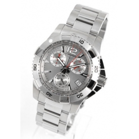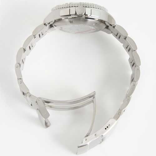シルバー文字盤に蛍光塗料を施した同色の指針、アラビラとバーのインデックスを配置。12時位置にブランドロゴ、2時位置に1/10秒計、4時位置に日付表示、6時位置にスモールセコンド、10時位置に12時間計を搭載。