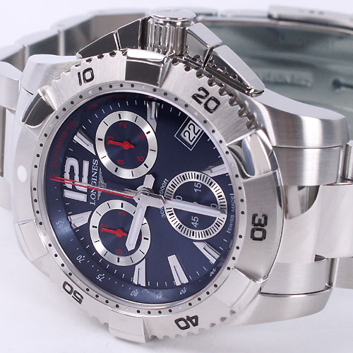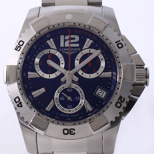 存在感ある直径41mmのシルバーステンレスケース。ブルー文字盤に蛍光塗料を施したシルバーの指針、 アラビアとバーインデックスを配置。12時位置にブランドロゴ、2時位置に10分の1秒計、4時位置に日付表示、6時位置にスモールセコンド(秒針用のダ イヤル)、10時位置に12時間計を搭載。文字盤内周にはスピードや平均時間を簡単に算出出来るタキメーター機能を搭載。
