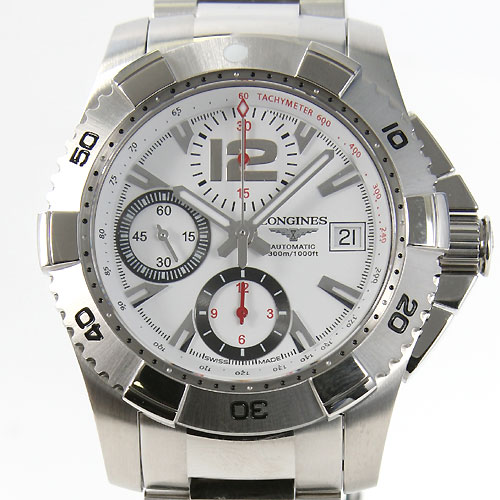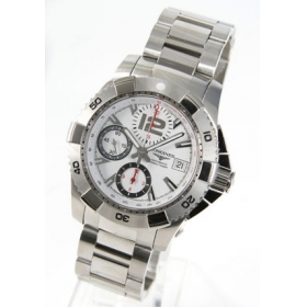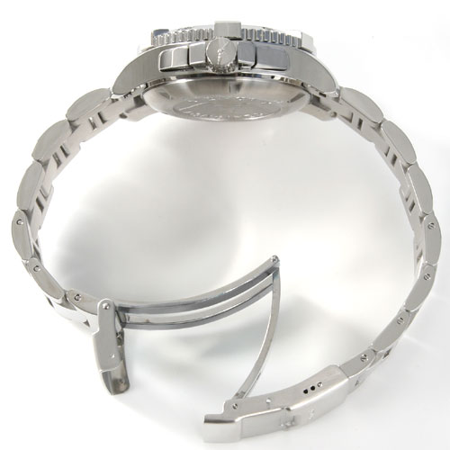 直径40mmを超える存在感があるケース。ホワイト文字盤に蛍光塗料を施したシルバーの指針、アラビラ とバーのインデックスを配置。12時位置に30分計、3時位置にブランドロゴと日付表示オートマチックと300m防水を示す刻印、6時位置に12時間計、 9時位置にスモールセコンドを搭載。